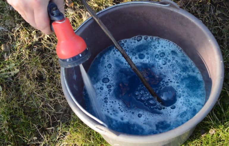 - Синий камень растворяет ещё в 10 л воды, взятой из бочки, чтобы потом влить в известковое молоко, которое образовалось после добавления разбавленной в воду извести.