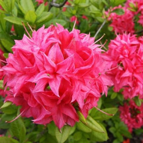 Homebush обильно цветет уже после 20 мая и до середины июня, параллельно с распусканием листьев. Цветки достаточно крупные для азалии, достигают аж 8 см в диаметре. Окрас насыщенный розовый. Цветы собраны в шарообразные соцветия по 12-15 штук. От них исходит слабовыраженный аромат.