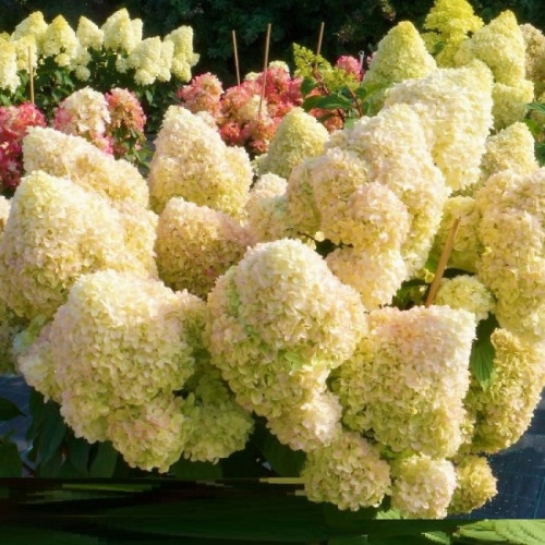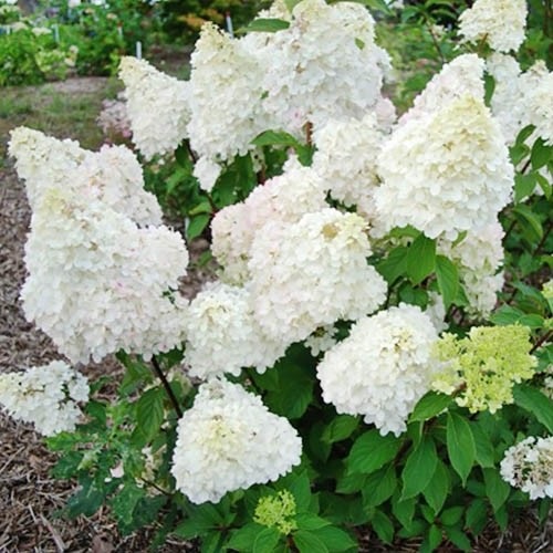 Эта метельчатая гортензия начинает свое цветение в июне с желто-зелеными или бело-золотистыми цветками. В середине июля они превращаются в белоснежно-белые, а в конце цветения в сентябре приобретают нежный светло-розовый оттенок. Длина соцветий может достигать 40 см и более, создавая впечатляющий эффект.