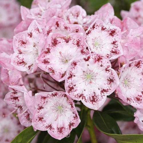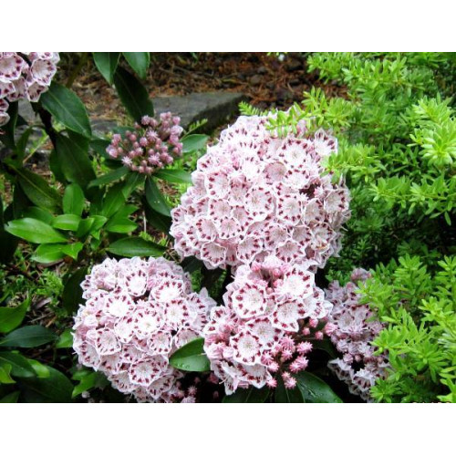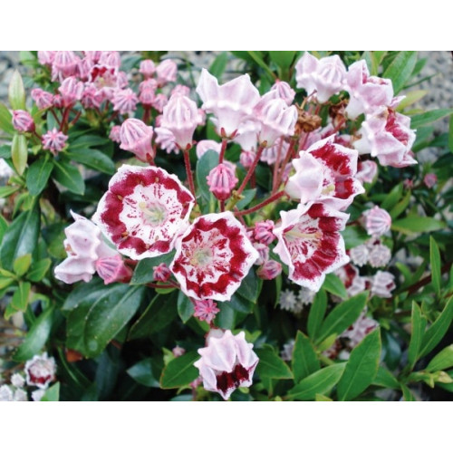 Кальмия широколистная – вечнозеленый компактный кустарник, достигающий в высоту 150 см. Побеги 'Ideal' зеленые с красноватыми прожилками. Листья широкие, ланцетовидные, края скрученные.
