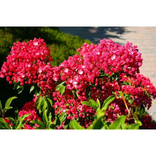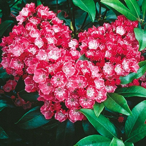 Декоративная ценность кальмии – цветы, распускающиеся на кусте в мае-июне. У них характерна структура, не встречающаяся у других видов растений. Они состоят из 5 сросшихся вместе лепестков, образующих форму крошечных зонтов. Цветки около 2-2,5 см в диаметре, собраны щитковидно на верхушках побегов. Они железисто-волосатые и липкие. Плоды мелкие, шаровидные, с засохшей пестикой наверху. Плоды кальмии несъедобны.