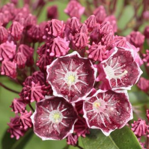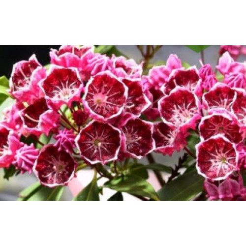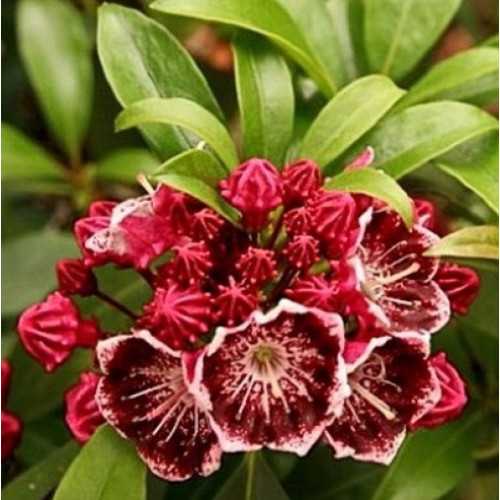 Сорт кальмии Merlin родом из Северной Америки. Растение отличается невероятной красотой. Экзотические цветы необычной формы и блестящие вечнозеленые листья сделают кальмию настоящим украшением вашего сада.
