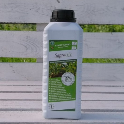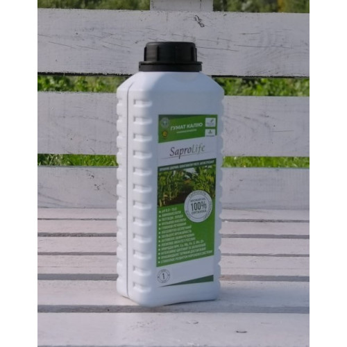 Органическое удобрение Сапролайф (SaproLife) Гумат Калия + микроэлементы жидкий 94% в расфасовке 1 л – это 100% природный биологический активатор роста растений, способствующий значительному увеличению плодородия растений.