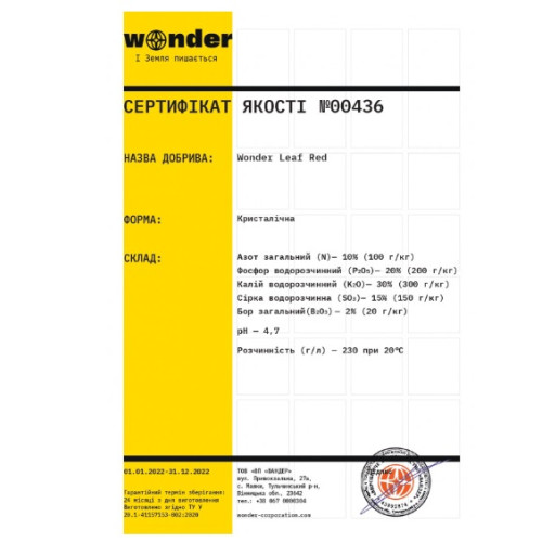 Wonder Leaf Red — минеральное удобрение, которое используется для внекорневой подкормки и фертигации в период формирования и созревания плодов. В состав удобрения входят следующие компоненты: азот (10%), фосфор (20%), калий (30%), сера (15%), бор (2%).