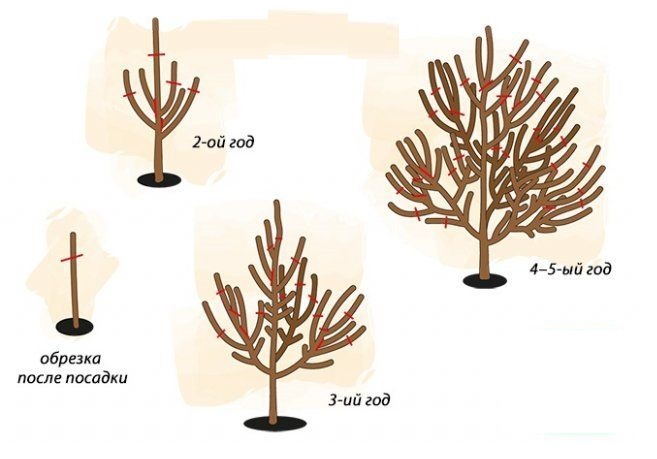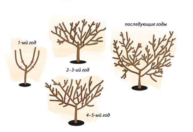 Здесь принцип тот же, что и у яблони, только ветви обрезают на боковой отросток, что препятствует образованию чрезмерного количества волчков. Со 2-го года растение формируют ярусами по несколько веерных скелетных ветвей, расположенных ниже, чем центральный проводник растения.