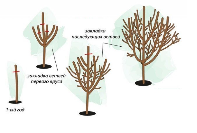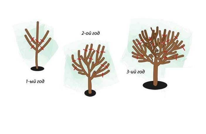 Центральный проводник обрезают до 75 см, сбоку мелкую поросль уменьшают на кольцо. В будущем году пару скелетных ветвей обрезают до 20 см, в то время как конкурирующие побеги срезают на кольцо. Далее центральный проводник делают меньше, чтобы он возвышался над боковыми ветвями сантиметров на 15.
