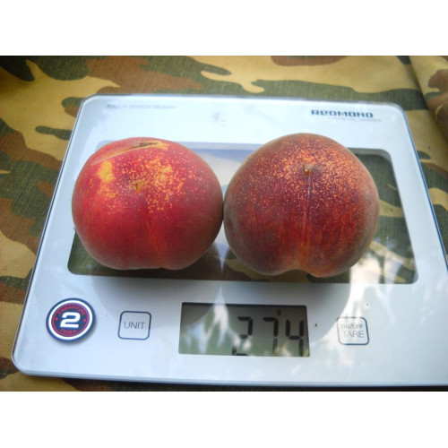 Основной цвет – желтый, но на 90 % плод покрыт рубиновым оттенком. Поверхность персика гладкая, без опушения. Косточка небольшая и приросшая к мякоти. Фрукт имеет насыщенный аромат и вкус, сочный и нежный. Весит в среднем 150-170 грамм, но встречаются и экземпляры по 200 грамм.
