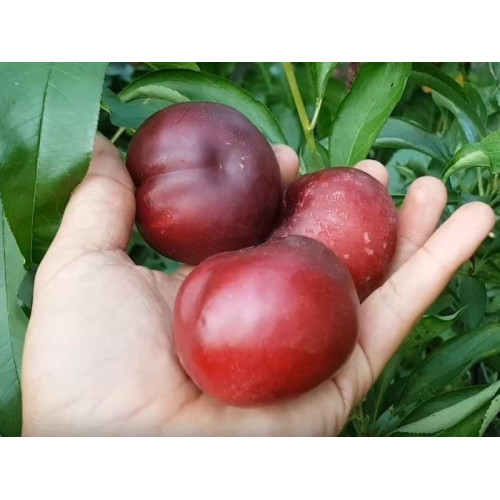 Плоды этого гибрида несколько похожи на персик, но без опушения. Своей специфической формой они напоминают также и помидор, ведь по обе стороны немного сплюснуты. Их средний вес составляет 70-100 г. Цвет плодов бордово-фиолетовый, мякоть желтовато-красная с небольшой косточкой, которая легко отделяется. Вкус приятный кисло-сладкий, одновременно напоминающий и сливу, и персик. Также многие отмечают, что он похож на вкус конфет "Дюшес". При перезревании вкус становится более сладким, утрачивая кислинку и свежесть. Плоды хорошо сохраняются, имеют хорошую транспортабельность.