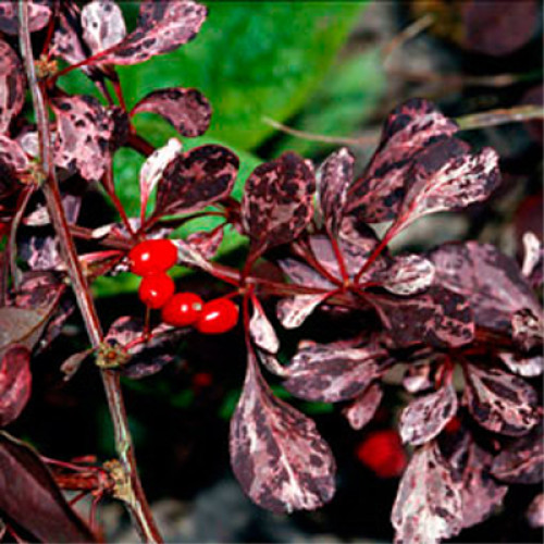 - строкатий і ефектний декоративний барбарис. Крона у цього виду листяних чагарників розлога і широка, прямозростаючі пагони згинаються, формуючи округлу густу форму.