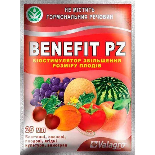 Бенефіт являє собою біологічний стимулятор росту, він призначений для збільшення розміру плодів. Варто зазначити, що даний препарат стимулює поділ клітин, що в дозволяє не тільки збільшити розміри плоду, а й покращує смакові якості.