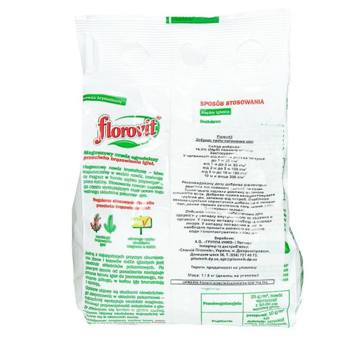 Флоровіт здатний захистити рослину від побуріння в посушливі періоди або взимку. Коли рослина не засвоює достатньої кількості мікроелементів листя починає жовтіти, а потім і зовсім темніє. Внесення Флоровіта активізує імунітет рослини, забезпечить додатковий захист від грибкових захворювань, поліпшить зовнішній вигляд кущів і дерев.