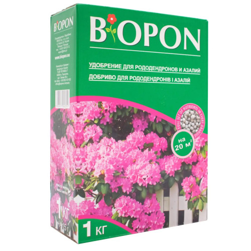 Добриво Біопон для рододендронів та азалій гранульоване призначене для підживлення в вегетаційний період. Серед іншого воно регулює рівень кислотності грунту, покращує зовнішній вигляд рослини, сприяє зміцненню імунітету та робить рослину більш стійкою до складних погодних умов. Також воно стимулює утвопення бутонів та гарнтує більш тривале та яскраве цвітіння.