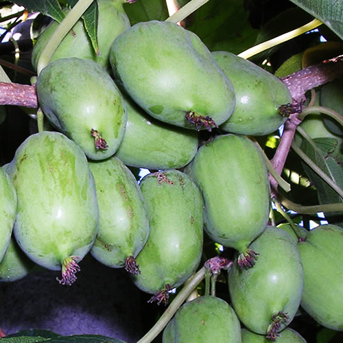 За весь термін плодоношення з дорослої рослини великоплідної Актинідії (6-7 рік після посадки) можна зібрати більше 10-12 кг. Плоди великоплідної Актинідії вагою досягають 19 грам. Вони мають зелений колір, формою схожі на ківі, тільки з гладкою шкіркою. Смак у цього сорту нагадує суміш смаків агрусу і ківі, має ніжний приємний аромат. Актинідія за своєю природою зимостійка рослина, здатна витримувати до -35 ° С, але в перший рік після посадки саджанці на зиму потрібно вкривати, щоб забезпечити їм хорошу приживлюваність. Плоди актинідії великоплідної можна і потрібно вживати свіжими, так як в них є величезна кількість вітамінів і поживних речовин для здоров'я організму. Так само вони стануть в нагоді для приготування джемів, лікерів, настоянок, їх сушать на родзинки.