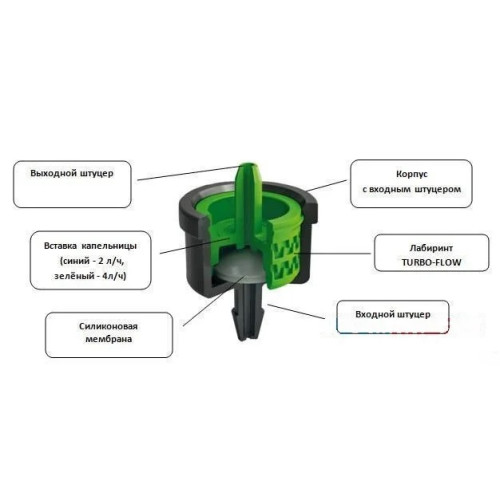 Компенсована крапельниця 8 літри на годину використовується для організації крапельного поливу плодових і ягідних рослин, які знаходяться на одне лінії. Можливий варіант підключення до неї конекторів для розведення води під рослини.