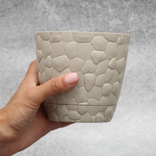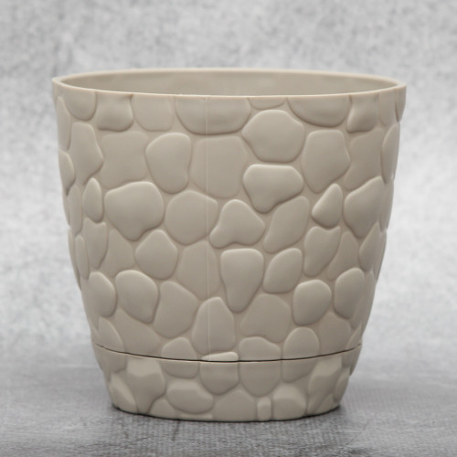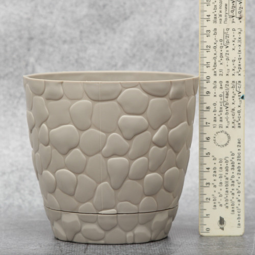 Вазон для рослин Elif "Камені" 0,75 л, виготовляють зазвичай в сірому кольорі з високоякісного турецького пластика. Такий вазон має округлу форму, а з зовнішнього боку декорований дрібними камінчиками. У комплект при замовленні такого вазона входить спеціальна підставка, яка захищає рослину від зайвої вологи.
