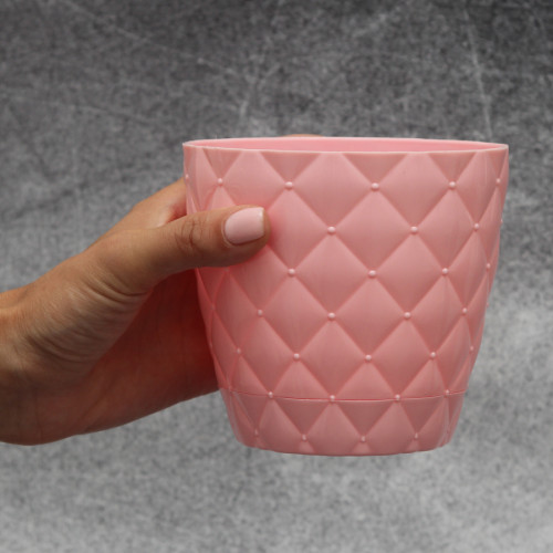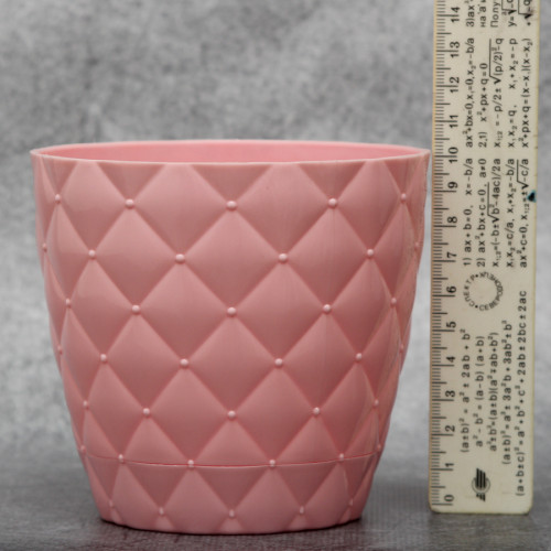 Вазон для рослин Elif "Ромб" 0,75 л, виготовляють з турецького пластика в рожевому кольорі. Вазон має округлу форму, а його зовнішня частина декорована маленькими ромбіками. У комплект до такого вазону входить спеціальна підставка, яка захищає рослину від надлишку вологи.