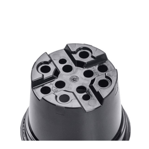 Горщик виготовлений із міцного полімеру, який витримує багаторазове використання. Його конструкція передбачає стандартне рифлене дно з розширеною кількістю отворів (ZD+), що покращує дренаж, а також боковий отвір під етикетку типу ET3 (шириною 4 см), що спрощує маркування при масовому вирощуванні.