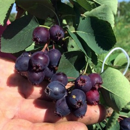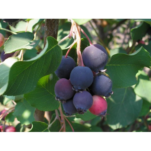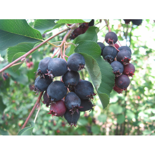Ягоди дозрівають рано. Плоди досить великі, до 17 мм у діаметрі. Форма округла, забарвлення синьо-чорне з незначним нальотом. Ягоди ірги дуже соковиті та солодкі. Вони зібрані у суцвіття в середньому по 10 ягід. Дозрівання нерівномірне.
