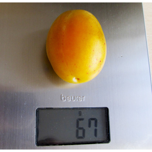 Сорт Бурштинова Мліївська великоплідний, його сливи в середньому важать 45 грам, але так само часто зустрічаються екземпляри близько 70 грам. Плоди у сливи даного сорту мають яйцеподібну форму, шкірку лимонно-жовтого кольору, тонку, але міцну. М'якоть м'яка, жовта, соковита, трохи волокниста, легко відділяється від кісточки.