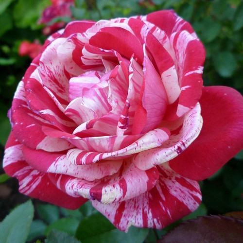 Це красива яскрава троянда, яка цвіте насиченим малиновим відтінком. Її великі квітки, що розкрилися з класичних бутонів, мають приємний малиново-червоний відтінок з білими лініями.