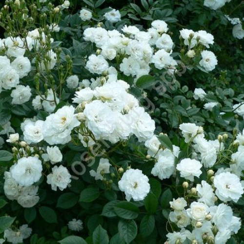 Бутони мають трохи довгасту форму, які розкриваються в пишні, махрові, білі квіти. Квіти тривалий час зберігають свіжість, як на кущі, так і в зрізаному вигляді. На кущі формуються пухкі кисті, з кількістю бутонів до 15 штук, дружного цвітіння. Діаметр квітки 9 см. Трояндочки виділяють тонкий аромат.