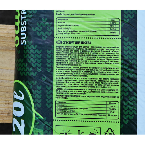 Як добавки в ньому міститься вапнякове борошно, стимулятор для кращого усмоктування води і добрива з мікроелементами. Торф'яний субстрат розфасований по 20 л. Кислотність становить 5,5-6,5 рН.