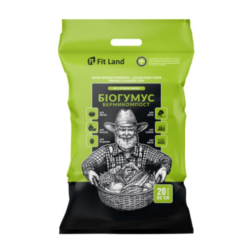Зовні це чорна або темно-коричнева речовина з гранульованою структурою, пахне свіжою землею. Економічна упаковка Fit Land 20 л дозволяє заощадити, купуючи стільки біогумусу, скільки потрібно.
