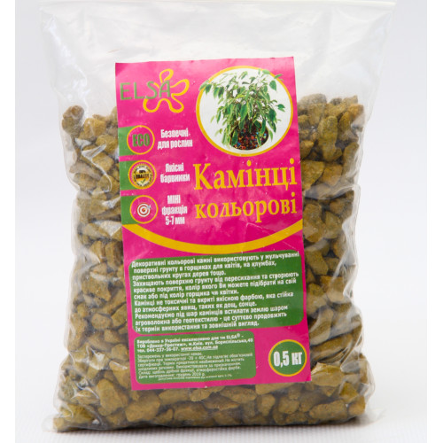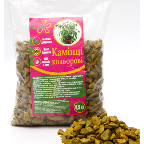 Камені декоративні жовті ELSA розфасовані в пакети по 500 грам. Це ідеальний варіант для мульчування і прикраси горщика з рослиною. Використання каменів не тільки прикрашає рослину, а й уповільнює випаровування вологи.
