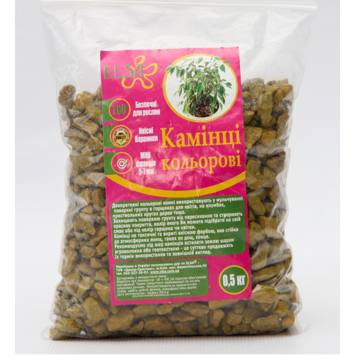 Декоративні жовті камені ELSA покриті спеціальною фарбою, яка захищає кам'яну крихту від зовнішніх агресивних чинників. Камені пофарбовані за європейською технологією, що дозволяє отримати досить насичені кольори. Згодом фарба не змивається, а значить ніякі речовини не потрапляють в грунт і не шкодять рослині. Навіть через кілька років використання каміння будуть такими ж яскравими як в перший день.