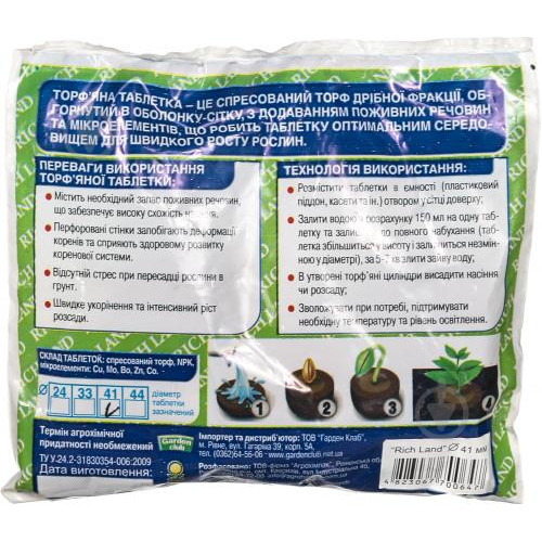 Використання торф'яних таблеток сприяє інтенсивному росту і розвитку рослин за рахунок хорошої світло- і водопроникності. Оптимальний склад необхідних речовин, які забезпечать хороше зростання розсади. Таблетки повністю розчиняються в грунті, при цьому виключені пошкодження кореневої системи рослин при пересадці.