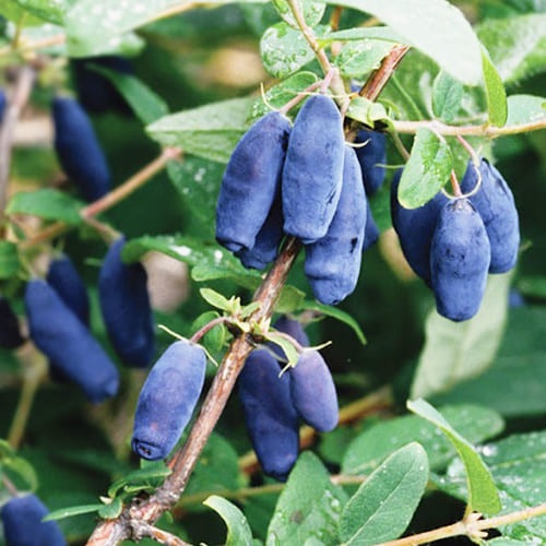 Плоди. Плоди циліндричної форми, соковиті та смачні, але їх смак є дещо незвичайним для жимолості. Синього кольору, мають вагу 2 грами. Ягоди міцно прикріплені до плодоніжки, здатні залишатися на гілках до повного висихання (перетворюються на родзинки). Термін дозрівання – кінець травня та до кінця червня. З дорослої рослини можна зібрати близько 4 – 5,5 кілограмів ягід.