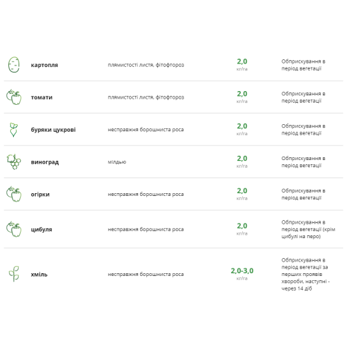 Рекомендуємо обробляти виноград, картоплю, огірки в період вегетації з нормою внесення в 2,0 кг/га. Препарат Акробат буде ефективний при таких захворюваннях як: фітофтороз, альтернаріоз, пероноспороз, мілдью. Час очікування до збору урожаю не менше 20 діб, максимальна кількість обробок - 3 шт.