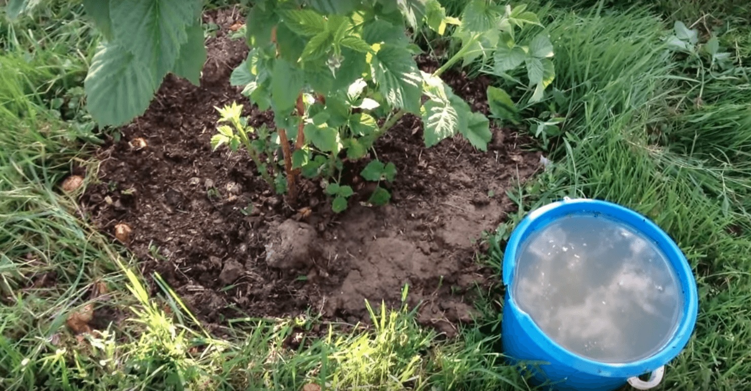 - Настой коровяка – 1/3 ведра залить водой доверху и поставить бродить на неделю, периодически помешивая. Через 7 дней разбавить настой водой в пропорции 1:10 и полить малину – ведро на 1 м².