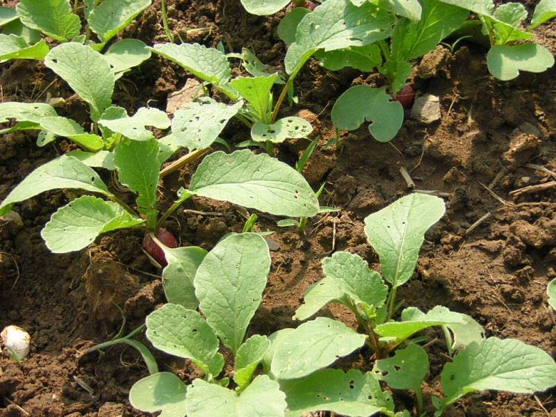 - Если всё же садовод высадил редис намного чаще, чем рекомендуется, всегда можно его проредить. Расстояние между растения в одном ряду — 3 см, классическая схема.