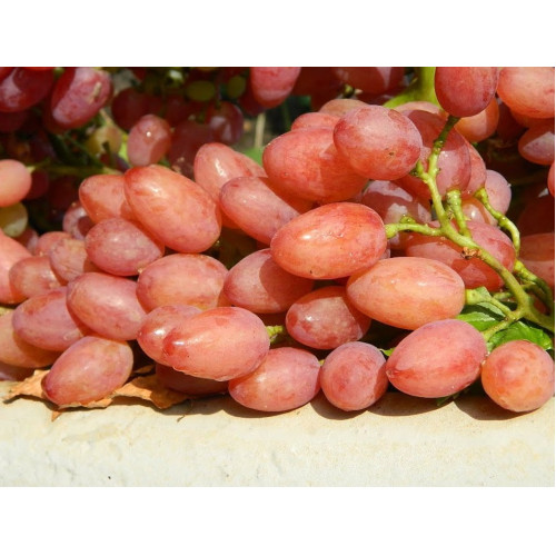 Грозди вырастают среднего и крупного размера, около 500-600 грамм, рыхлые, чаще всего с лопастями, могут быть и 40 см в длину. Форма гроздей кишмиша Лучистого удлиненно конусообразная. Ягоды розового цвета, имеют овальную, слегка вытянутую форму, вес каждой может быть от 2,5 до 4 грамм. По структуре плоды этого сорта винограда плотные, мякоть мясистая, сочная. Вкус у этого кишмиша сладкий, имеет мускатный привкус и аромат. Ягоды высокотранспортабельны, могут долго храниться в свежими, не утрачивая при этом коммерческой привлекательности. Столовый сорт не отличается морозостойкостью, поэтому ему требуется укрытие на зиму.
