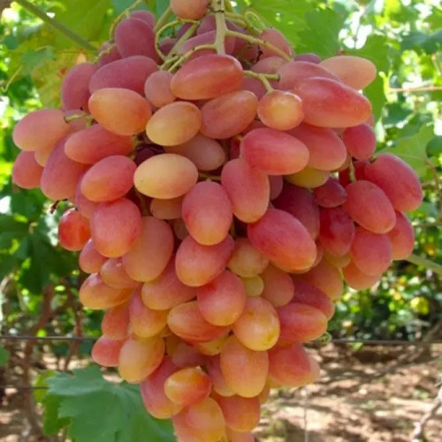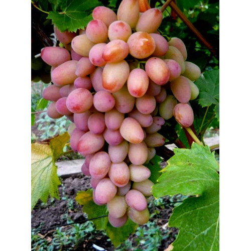 Сбор урожая приходится на август, а созревание плодов происходит через 105-115 дней после цветения. Грозди винограда поражают своим огромным размером – от 800 до 1500 граммов, они имеют среднюю плотность и конусообразную форму. Ягоды этого сорта розового цвета, также крупные – от 12 до 18 граммов, овальной формы с вкусной мякотью и тоненькой кожурой. Вкус винограда выразителен и гармоничен, а аромат приятный. В середине ягод обычно находится 2-3 косточки.